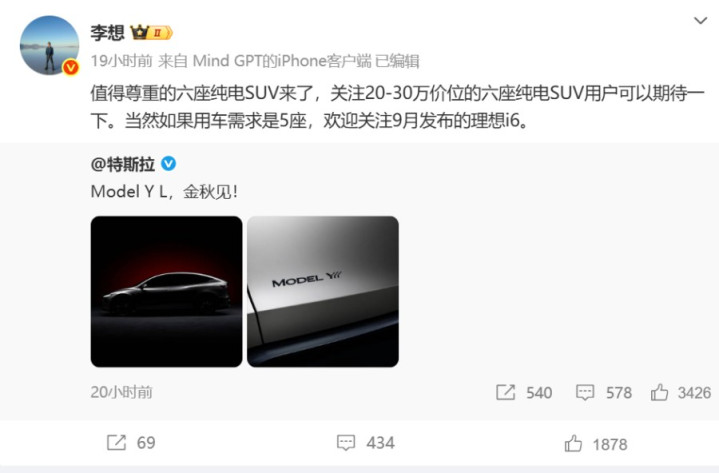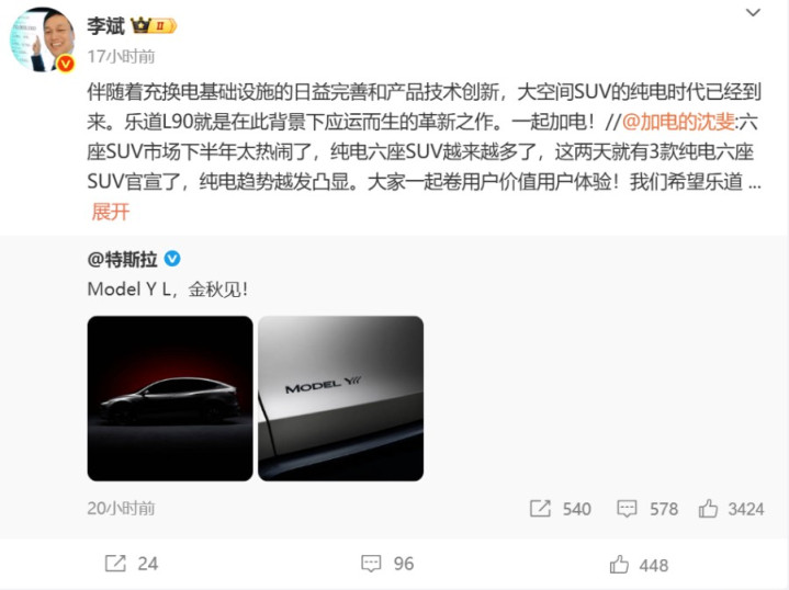 有意思的是,特斯拉突放大招也引发了连锁反应。理想汽车CEO李想7月16日当晚就转发相关微博称“值得尊重的六座纯电SUV来了”,并借机预热自家9月将发布的五座纯电车型i6。蔚来李斌则表示“大空间SUV的纯电时代已经到来”,需要注意的是蔚来旗下乐道品牌L90车型已于7月10日开启预售,27.99万元起的定价直接切入了中端市场。