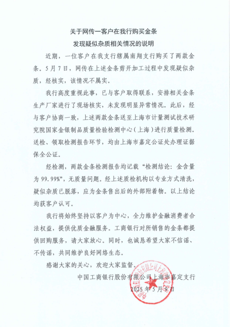 在公告中,工商银行上海市嘉定支行称,“我行高度重视此事,已与客户取得联系,安排相关金条生产厂家进行了现场核实,未发现明显异常情况。”